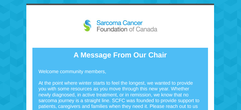 It is our mission to connect patients and their families with the best medical information and community resources, to ease the process of dealing with a sarcoma cancer diagnosis and treatment, while advocating on behalf of Canadian patients. We support advances in Canadian sarcoma cancer research and the connectivity of our sarcoma community.